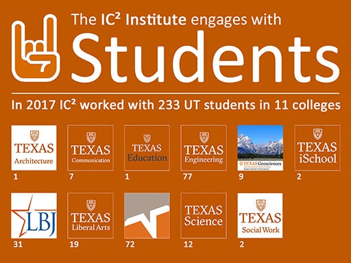 Through UT courses, internships, and collaborative programs, in 2017 the IC² Institute engaged with 233 students across 11 colleges and schools at UT. These include over 50 UT students who participated in IC² international entrepreneurial programs. Outside of UT, in 2017 IC² worked with an additional 125 international students across four continents through graduate degree programs, courses and internships.
