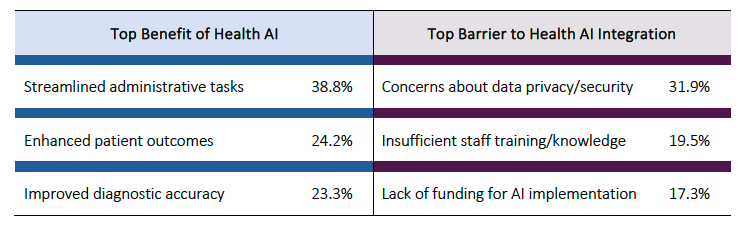 - Barriers to Adoption: More than half of respondents, 57%, were “neutral” or “not very confident” in their organization’s ability to integrate AI into their workflow. Respondents cited three primary barriers to health AI integration: concerns about data privacy and security; lack of knowledge and insufficient staff training; and lack of funding.