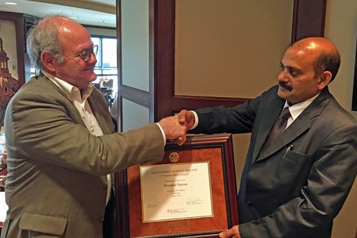 Nirankar Saxena (right) receives certificate from Sid Burback of the IC² Institute.