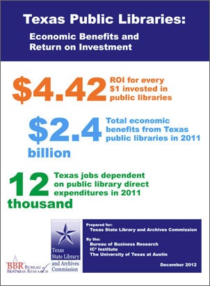 In 2011 Texas public libraries collectively were found to provide $2.407 billion in benefits while costing less than $0.545 billion, a return on investment of $4.42 for each dollar invested, according to a study released in December, 2012 by the Bureau of Business Research.