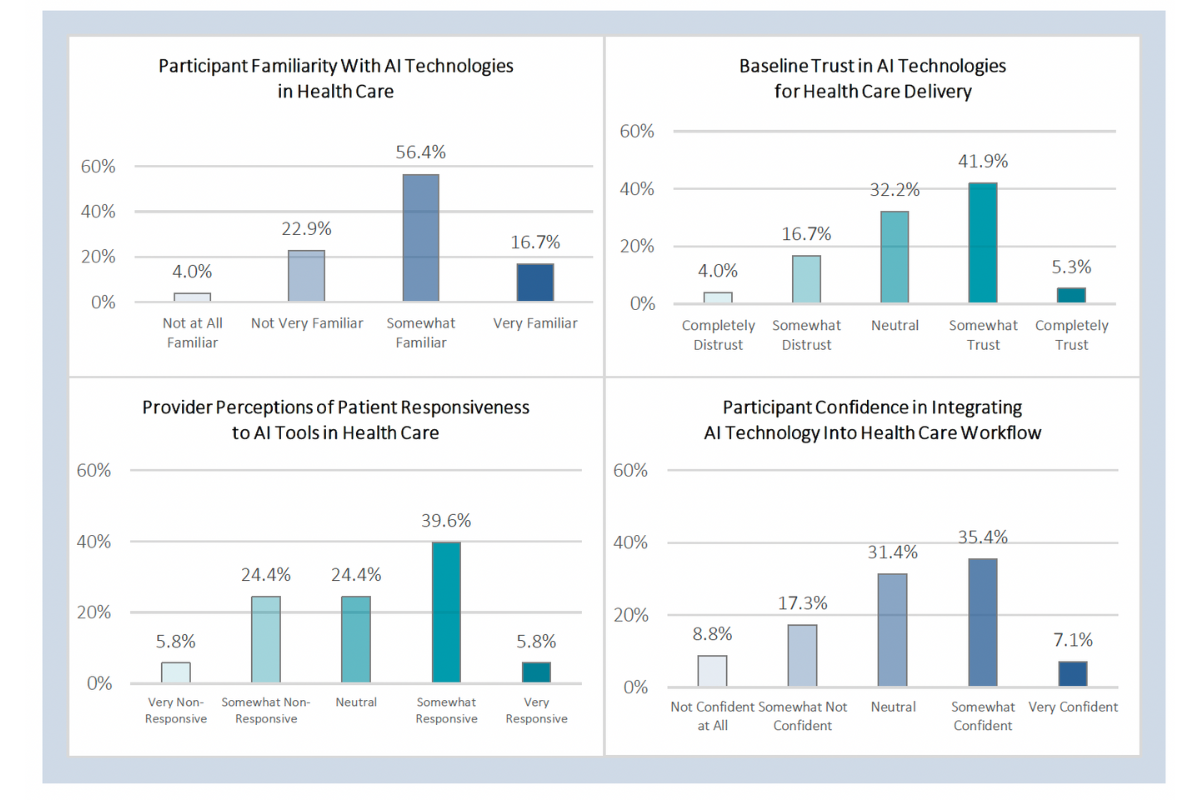 When it comes to integrating AI technology into health care, more than half of respondents, 57%, were neutral or not very confident in their organization’s ability to integrate AI into their workflow. Respondents cited a number of challenges: concerns about data privacy/security; insufficient training/knowledge; inadequate funding for AI implementation, inadequate technical infrastructure, and resistance to change among providers and patients.