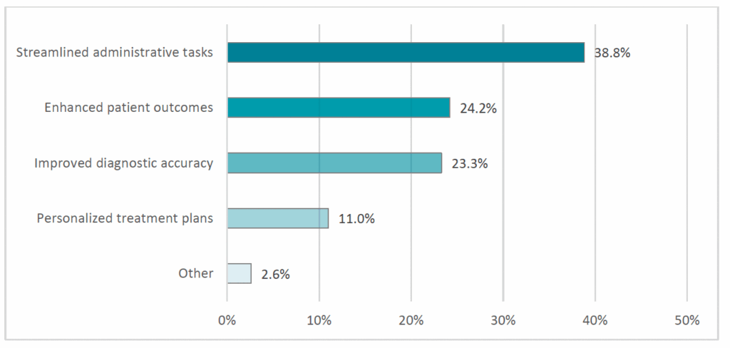 When asked to consider what they perceived to the top benefit AI in safety-net service settings, participants responded most often with these three benefits: streamlining of administrative tasks, enhanced patient outcomes, and improved diagnostic accuracy.