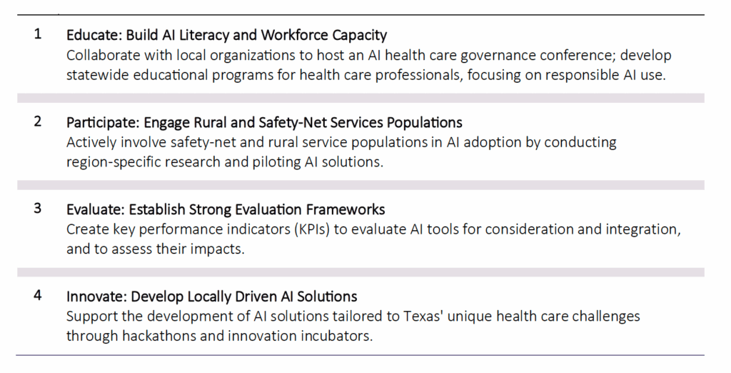 Based on our findings, we have outlined four recommendations to guide leaders in developing a holistic and strategic approach to AI that will improve care for rural and safety-net populations. See full report for expanded version of recommendations, including action steps.