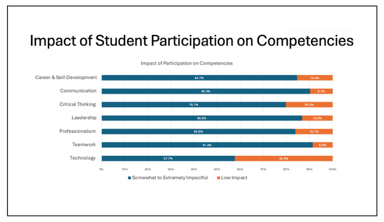Students shared how their involvement outside the classroom helped them develop seven key skills that employers want as outlined by the National Association of Colleges and Employers (NACE): career & self-development; communications; critical thinking; leadership; professionalism; teamwork; technology. The survey also included space for personal reflection, offering firsthand insights into how student involvement shapes their experiences and future careers.